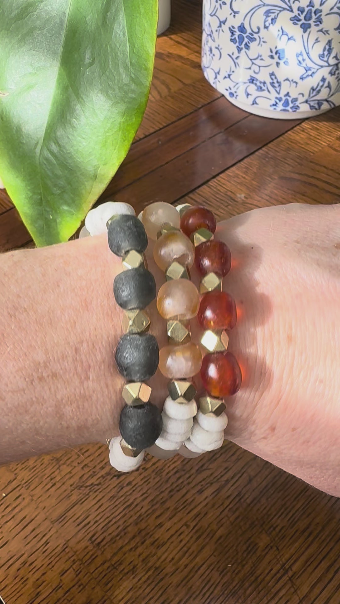 Each bracelet is handmade from recycled glass and natural wood, making every piece truly one-of-a-kind. Due to the artisan nature and use of recycled materials, slight variations in color, size, and texture are natural and add to the unique character of your bracelet.